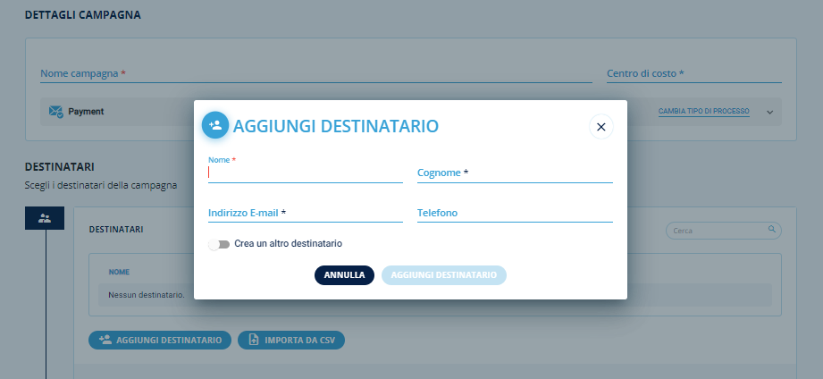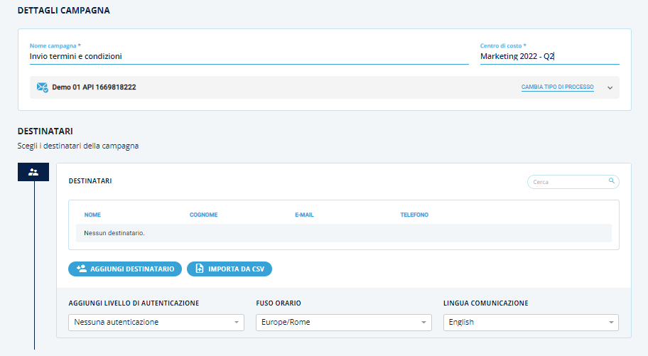 L’inserimento dei destinatari può essere one-to-one o di tipo massivo, ed è possibile inserirli dopo la creazione del processo, in fase di creazione della campagna di comunicazione.