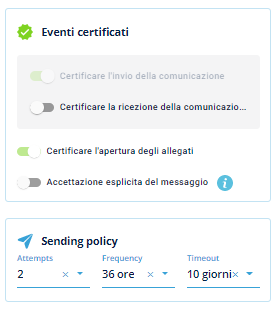 E’ possibile decidere il livello di certificazione ed eventuali allegati, la sending policy.