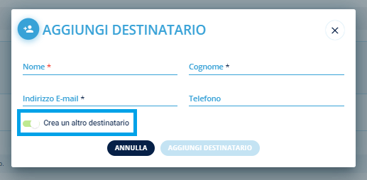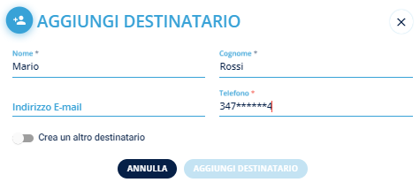 Se si tratta di un nuovo destinatario non presente in elenco si potrà procedere con l’inserimento cliccando su Crea un altro destinatario, editando i campi nome, cognome, indirizzo e-mail e numero di telefono, quest ultimo obbligatorio se è stato scelto il canale sms.