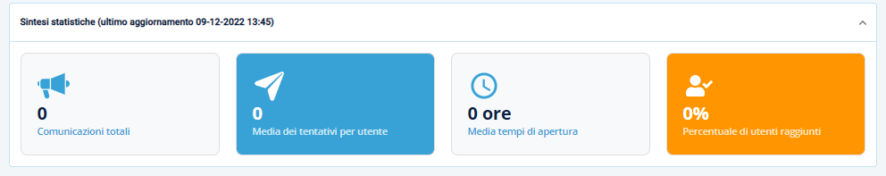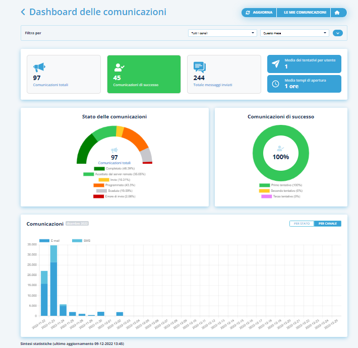 E’ possibile monitorare la gestione delle comunicazionitramite la Dashboard che permette di visionare, tramite dei grafici, le informazioni ad esse relative (totale delle comunicazioni, quante hanno avuto successo nell’invio al 1 tentativo ecc.), statistiche e conteggi delle stesse e ricercarle tramite filtri.