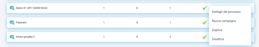 Una volta creato il processo, questo sarà recuperabile nella sezione Bozze presenti nella homepage, e, dopo averlo abilitato, si potrà procedere con la creazione della nuova campagna di comunicazione, cliccando sull’icona dei 3 puntini.