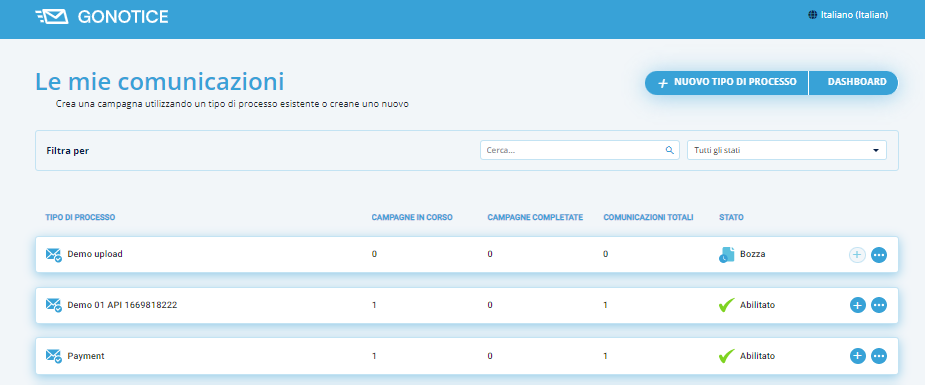 Effettuato l’accesso alla piattaforma certificata, sarà visionabile l’elenco dei Tipi di Processi, ovvero il punto di partenza per la creazione delle varie tipologie di comunicazioni attraverso specifiche campagne, e la possibilità di crearne di nuovi.