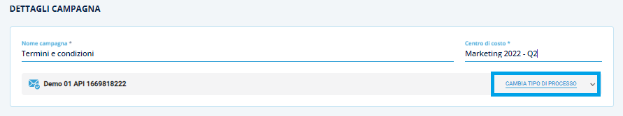 Tramite il tasto Cambia tipo di Processo, sarà possibile visionare la sintesi del processo creato in precedenza, con i parametri preimpostati che potranno essere modificati in base alle esigenze, scegliendone un altro.