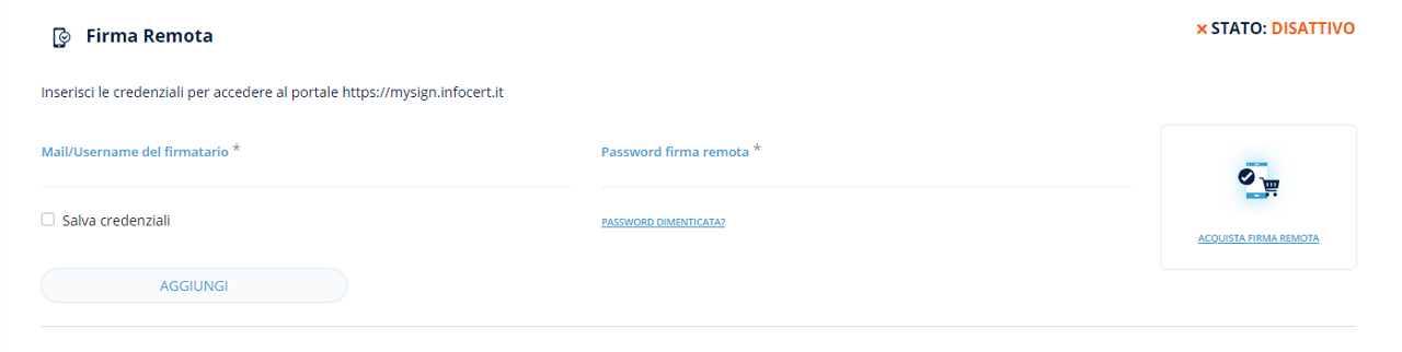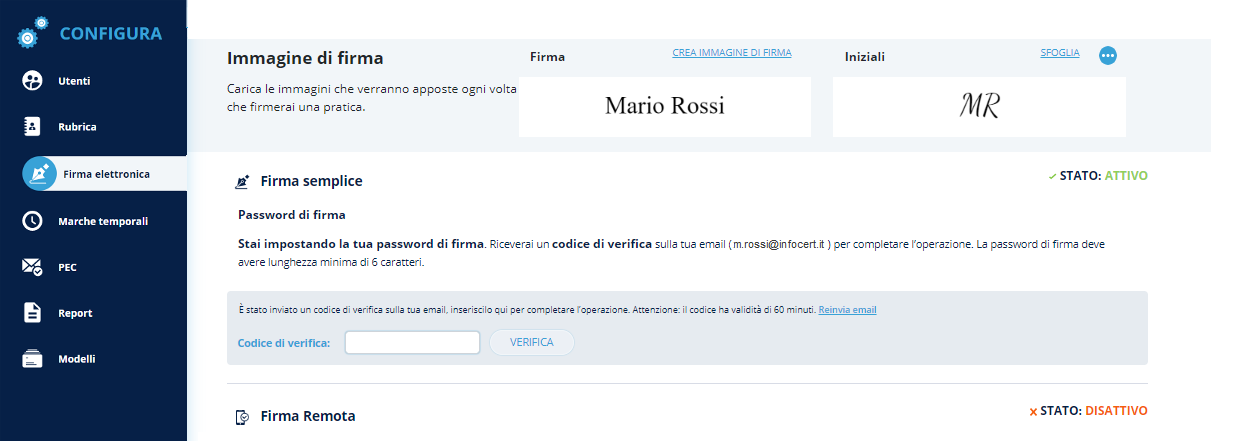 Sotto la sezione della FIRMA SEMPLICE è presente la sezione per la configurazione del certificato di firma remota.