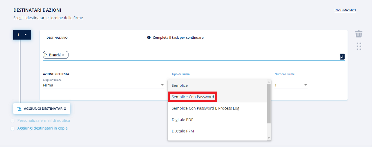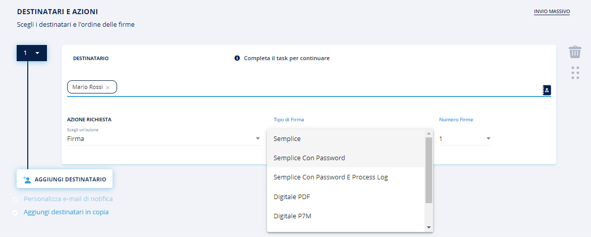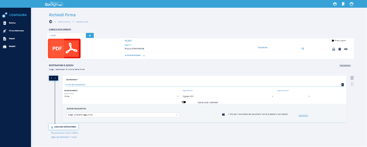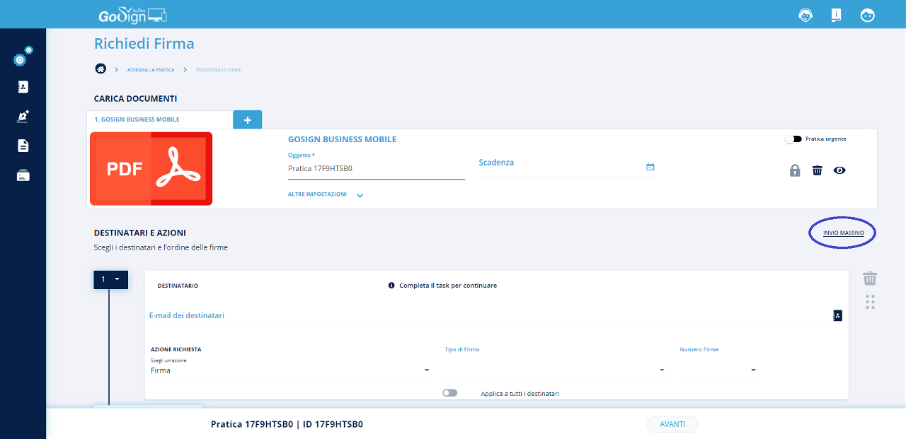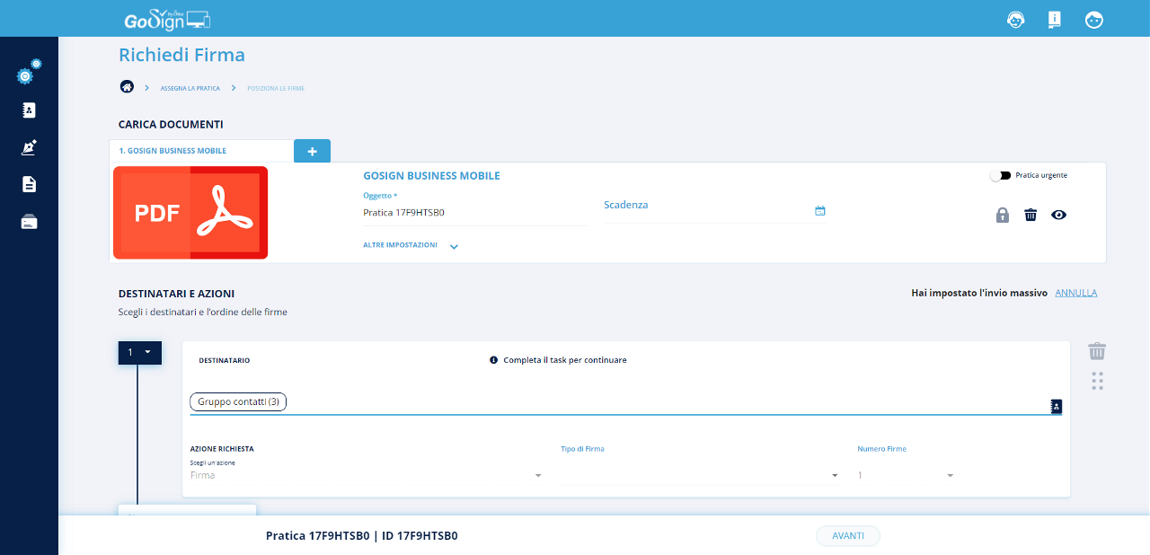 Invio multiplo: tale funzionalità consente di inviare un documento con campi dinamici (es. nome, cognome, firma, etc.) a tanti utenti in contemporanea e gestire poi le pratiche di firma per singolo utente;