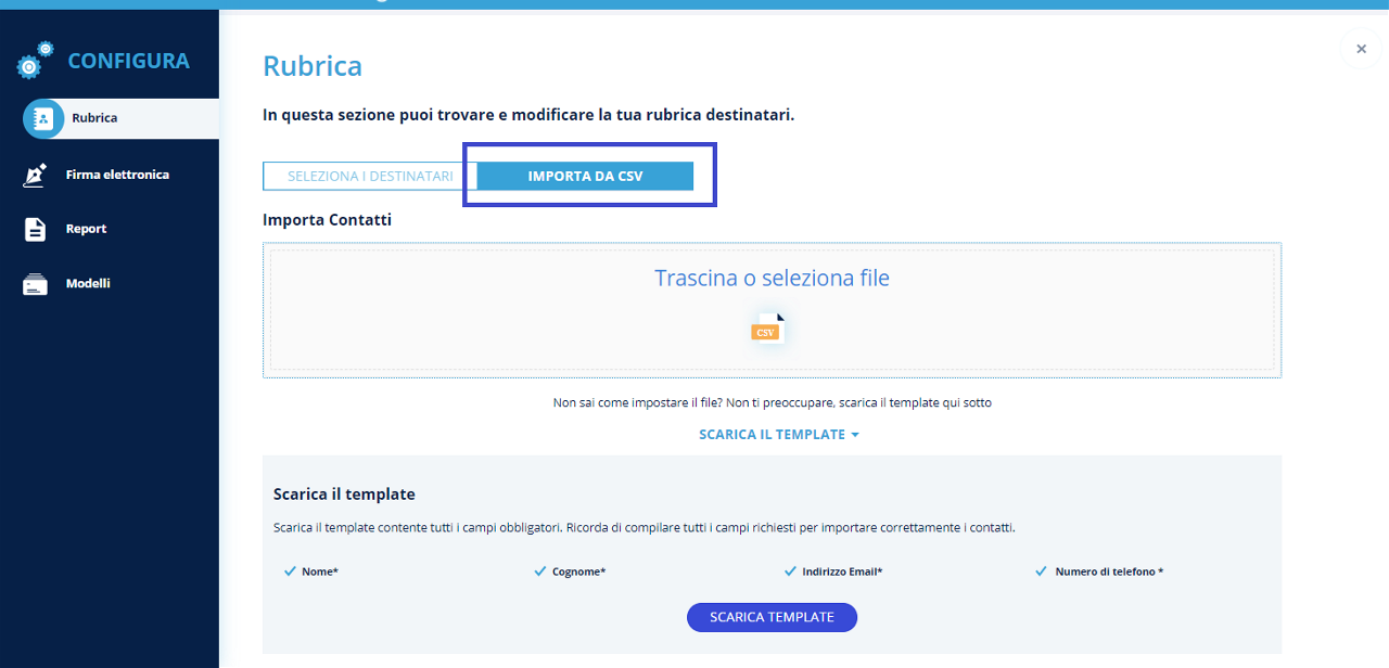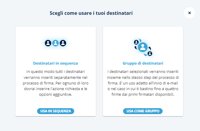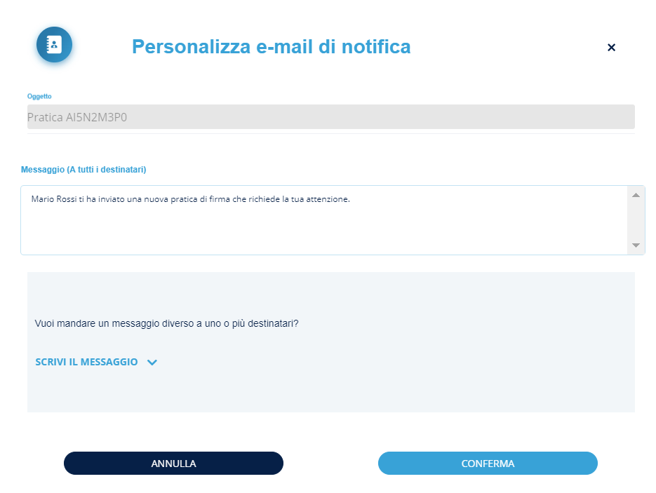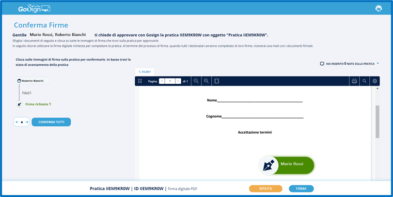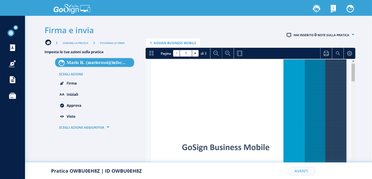 Invio multiplo: tale funzionalità consente di inviare un documento con campi dinamici (es. nome, cognome, firma, etc.) a tanti utenti in contemporanea e gestire poi le pratiche di firma per singolo utente;