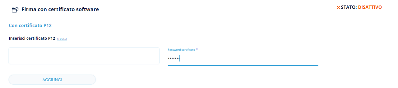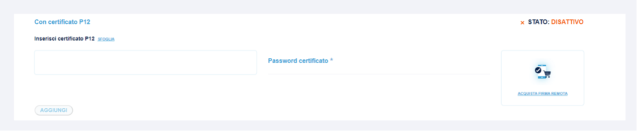 Per caricare il certificato bisogna cliccare sul link SFOGLIA e richiamare nel software il file del certificato p12. Una volta caricato, verrà richiesta la password per l'attivazione del certificato. Per procedere alla configurazione, sarà necessario cliccare su AGGIUNGI.