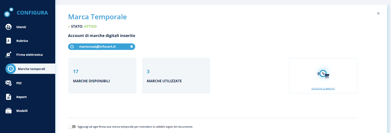 Una volta configurato, viene visualizzato lo stato delle marche temporali per quell'account: quando ne sono state usate e quante ne rimangono disponibili.