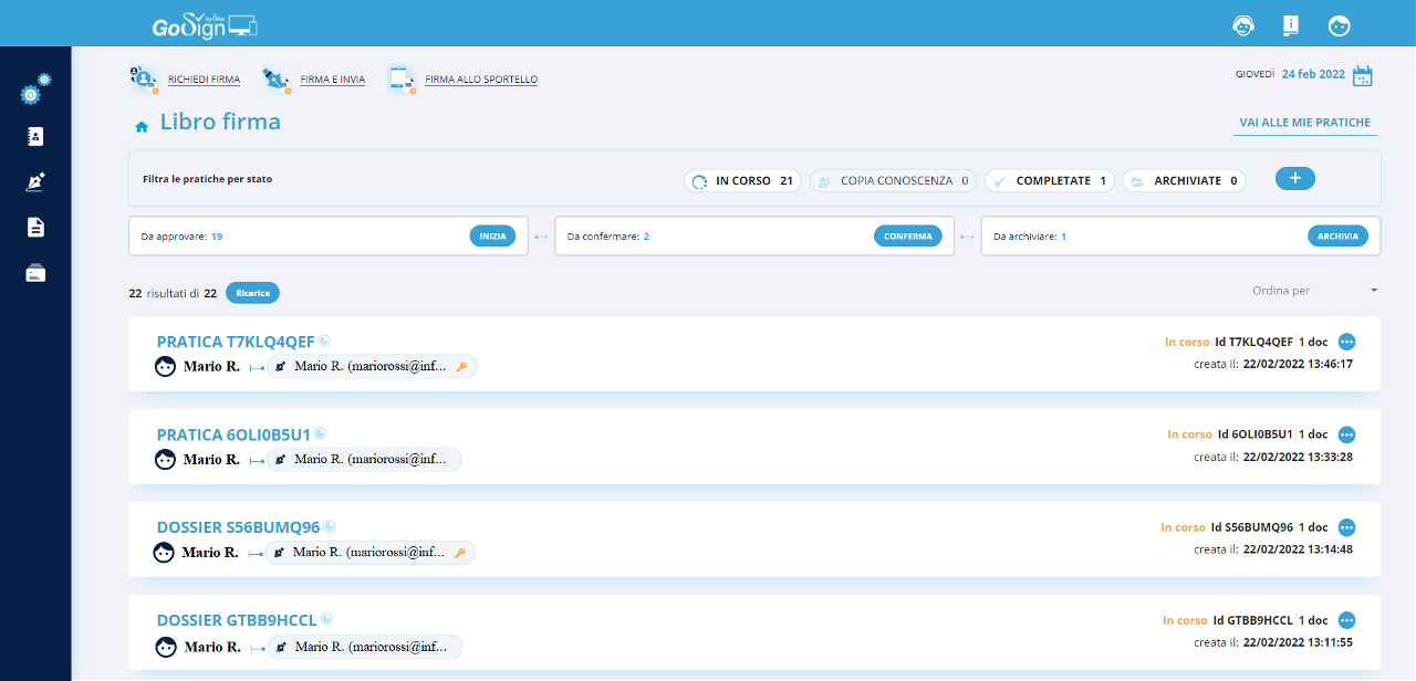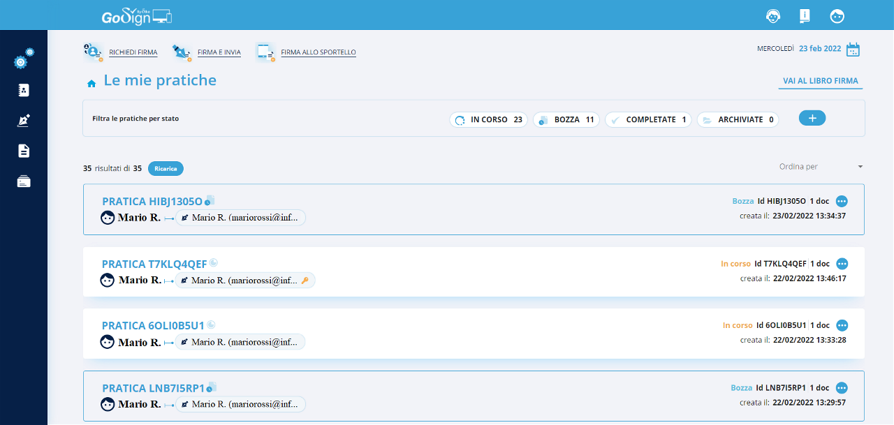 L'elenco delle pratiche di firma mostra i dettagli relativi alla pratica come: il numero di pratica, quanti documenti contiene, la data e ora di creazione, chi ha creato la pratica e chi ha firmato il documento e lo stato di avanzamento della pratica.