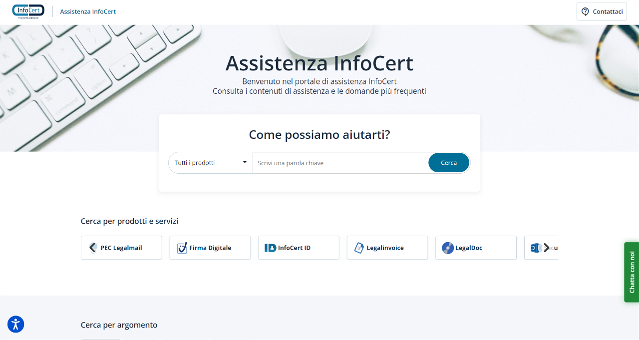 Nella parte alta della home page sono presenti tre icone che rappresentano l'"Assistenza all'Utente", le "informazioni sui prodotti/servizi InfoCert" e le "Impostazioni Utente".