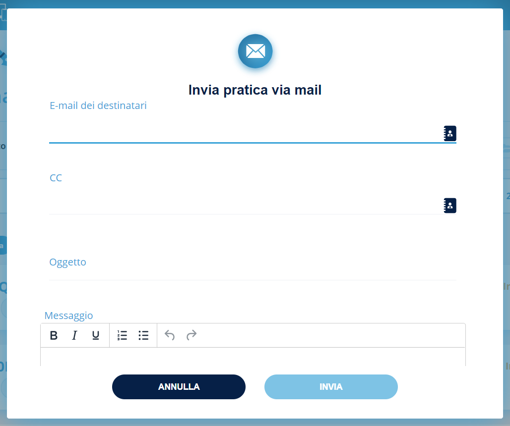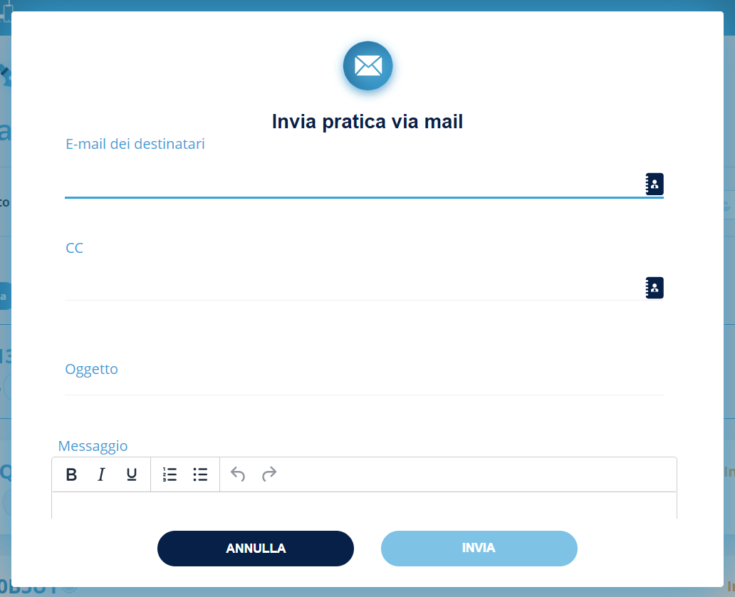 Con questa azione viene inviata la pratica e via email. Verrà aperta una finestra popup nella quale sarà possibile selezionare il destinatario, eventuali co-destinatari, l'oggetto e un eventuale corpo del messaggio.