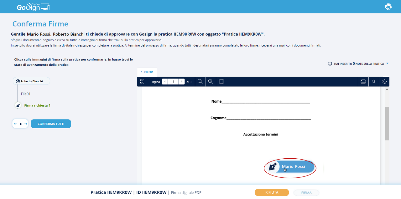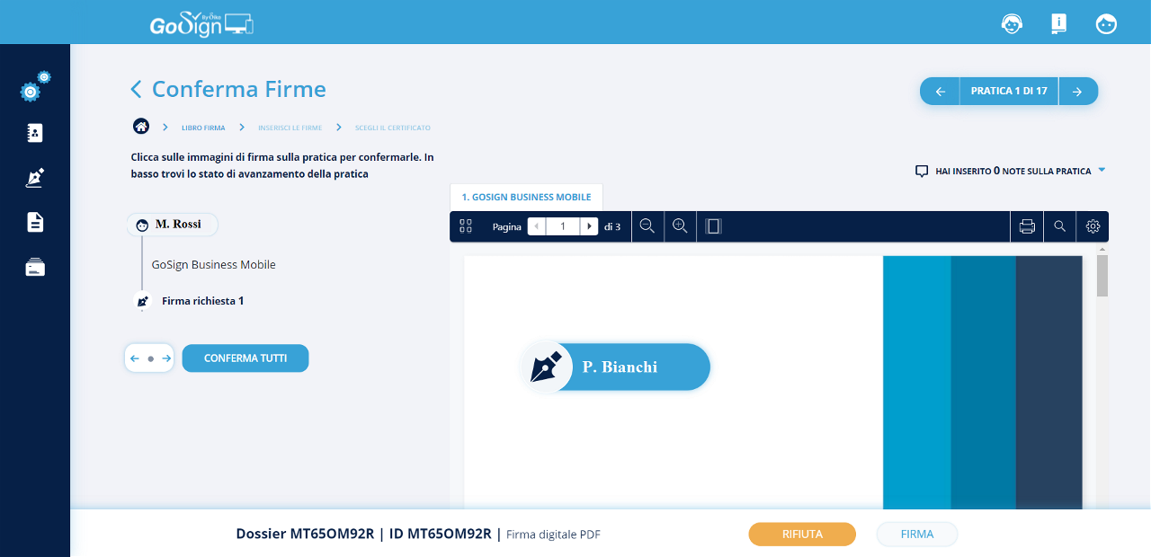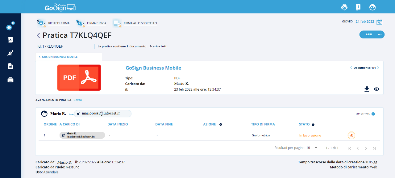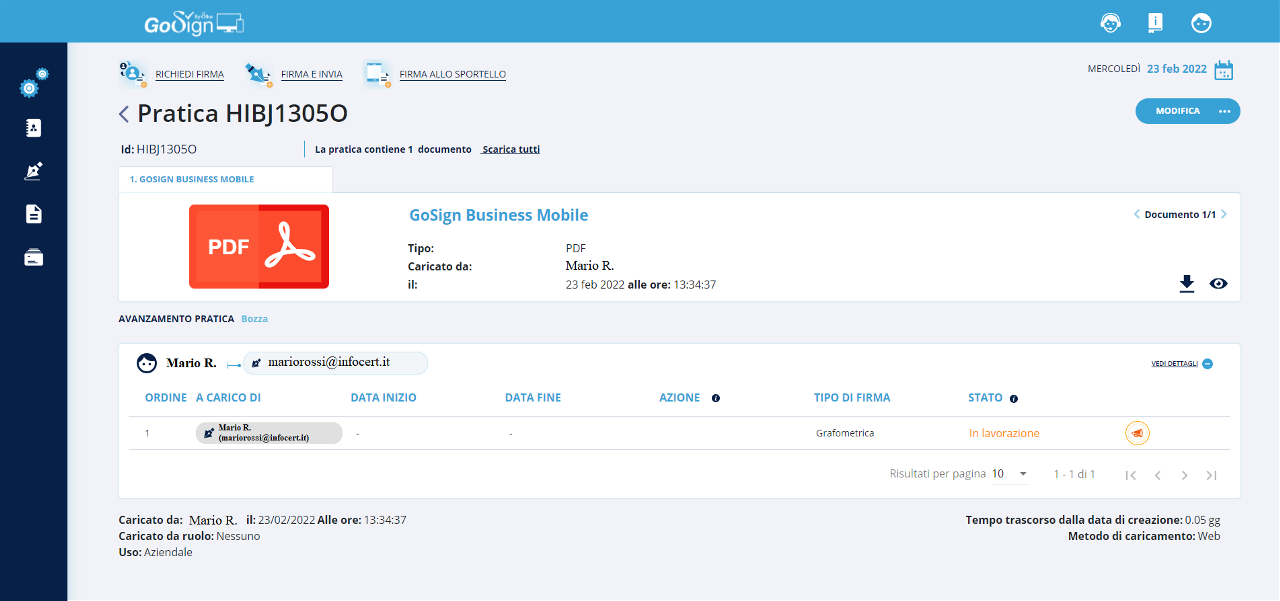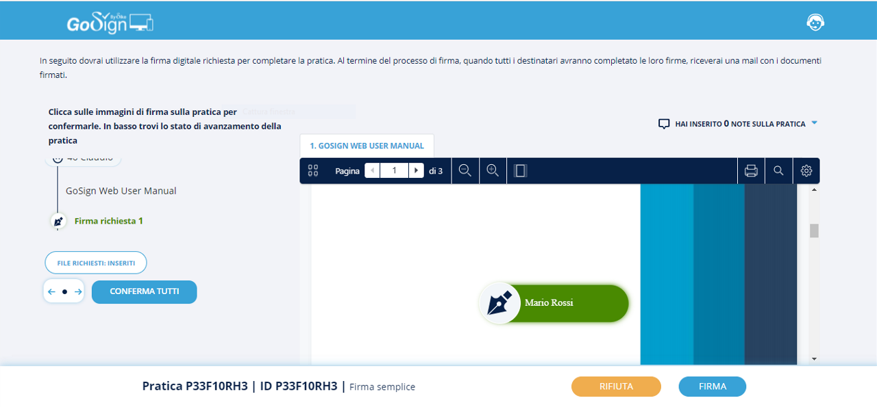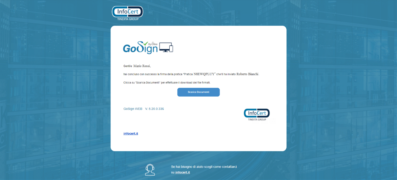 Tornando in GoSign, precedentemente lasciato aperto in seguito all’avviamento della pratica, si avrà la conferma dell’avvenuta firma.