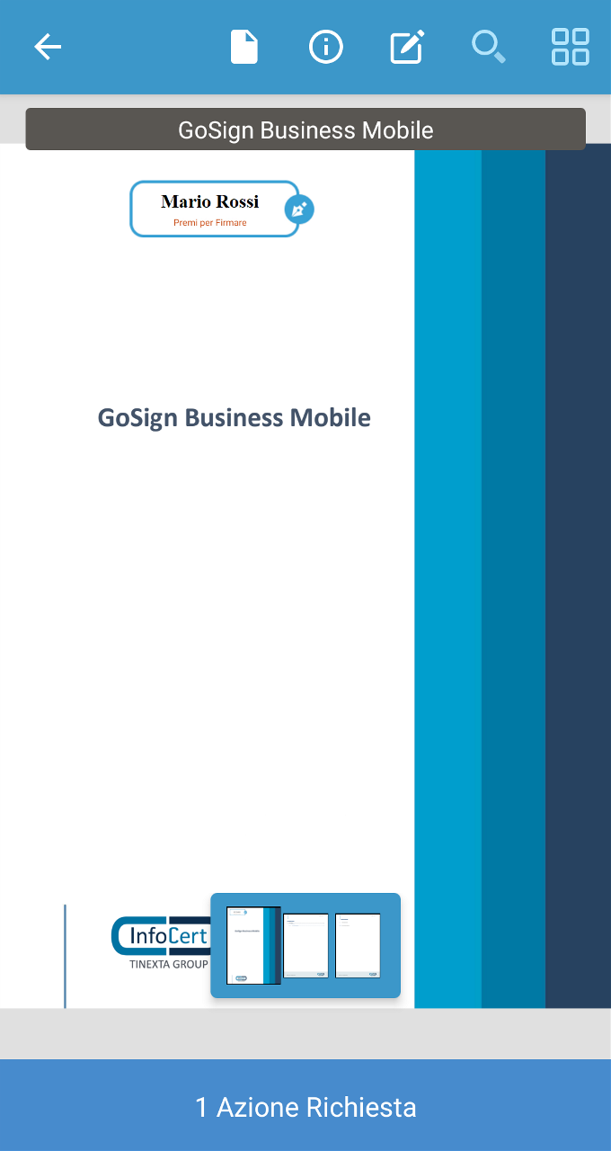 Firma: cliccando sull'anteprima del documento verrà posizionata un'icona sull'anteprima e sarà possibile impostare se si vuole o meno rendere visibile la firma sul documento. Si possono anche aggiungere informazioni aggiuntive come il Titolo, Organizzazione, Società, Titolo o Org.ne o Azienda oppure la data dell'operazione e se si vuole che la firma sia visibile sul documento;