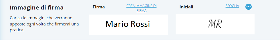Nella parte alta è presente la sezione Immagine di firma, dove sono visualizzati due riquadri di input che contengono la rappresentazione grafica della firma che verrà inserita sui documenti una volta firmati.