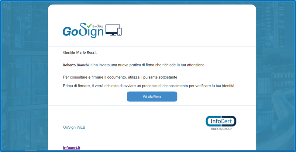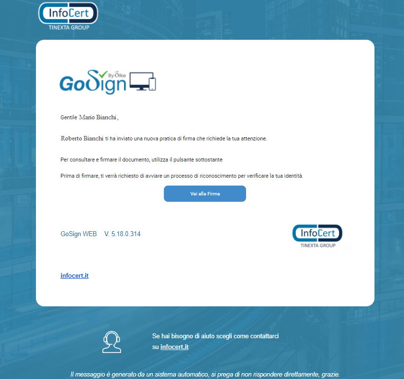 Cliccando su Vai alla Firma, si apre la pagina web con la procedura di sottoscrizione. La mail d’invito viene inviata sull’indirizzo e-mail dichiarato dal Cliente.