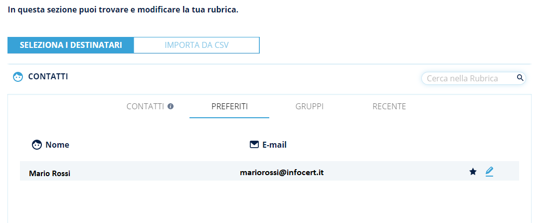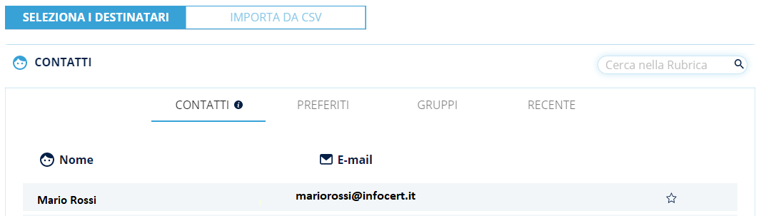 La rubrica si apre come un popup nel quale viene mostrato come prima schermata l'elenco completo dei contatti dell'organizzazione con i rispettivi Nomi, e-mail e la possibilità di aggiungere i contatti ai preferiti (cliccando sull'icona della stella).