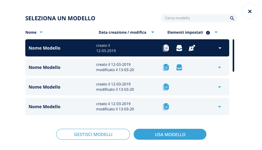 Infine, si può decidere se modificare o eliminare il modello in questione; le due operazioni di MODIFICA ed ELIMINA, una volta confermate, sono irreversibili.