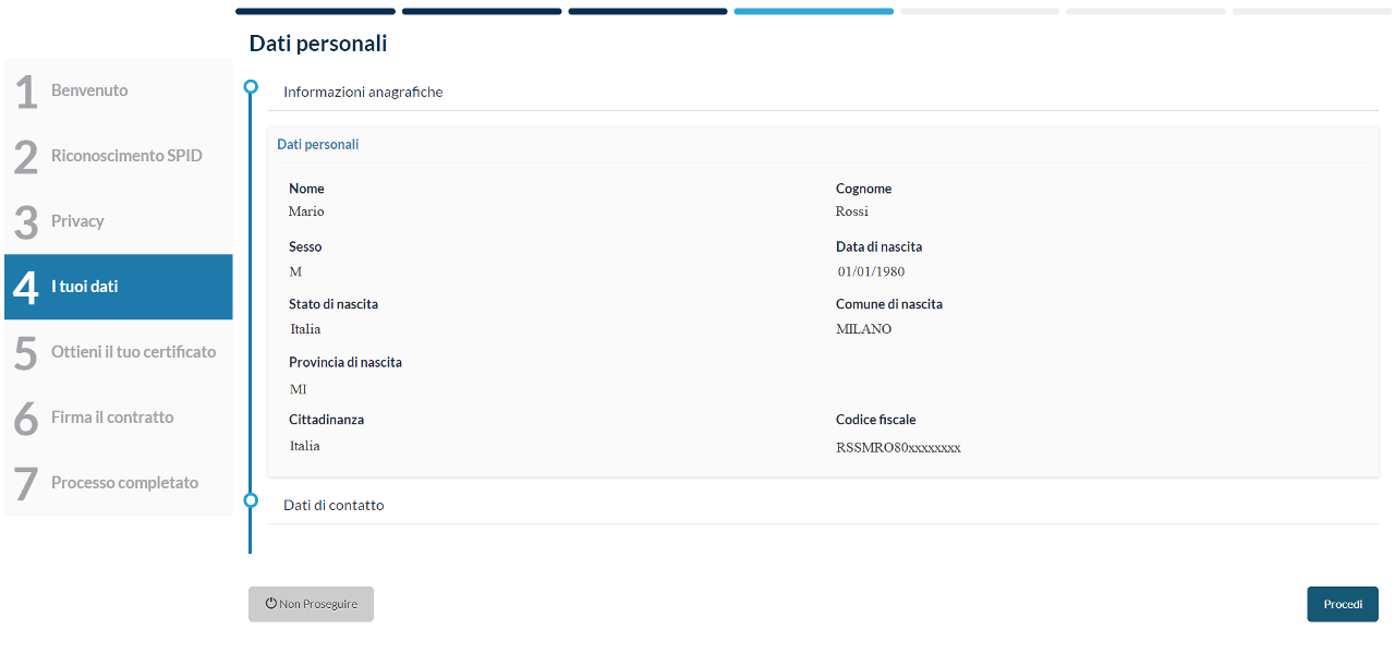 Il sistema riporterà i dati della persona che sta effettuando il riconoscimento. Un clic sul pulsante Avanti permetterà di procedere allo step successivo.