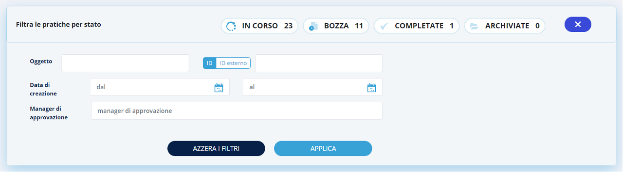 La ricerca delle pratiche può essere fatta applicando diversi filtri come Oggetto della pratica, il codice di pratica, l'intervallo di tempo di nel quale sono state create le pratiche o anche coloro che dovranno approvare la pratica.