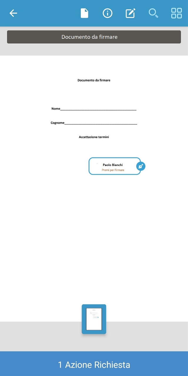 Iniziali: cliccando sull'anteprima del documento verrà posizionata un'icona sull'anteprima e sarà possibile impostare se si vuole o meno rendere visibile la firma sul documento;