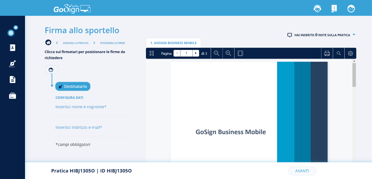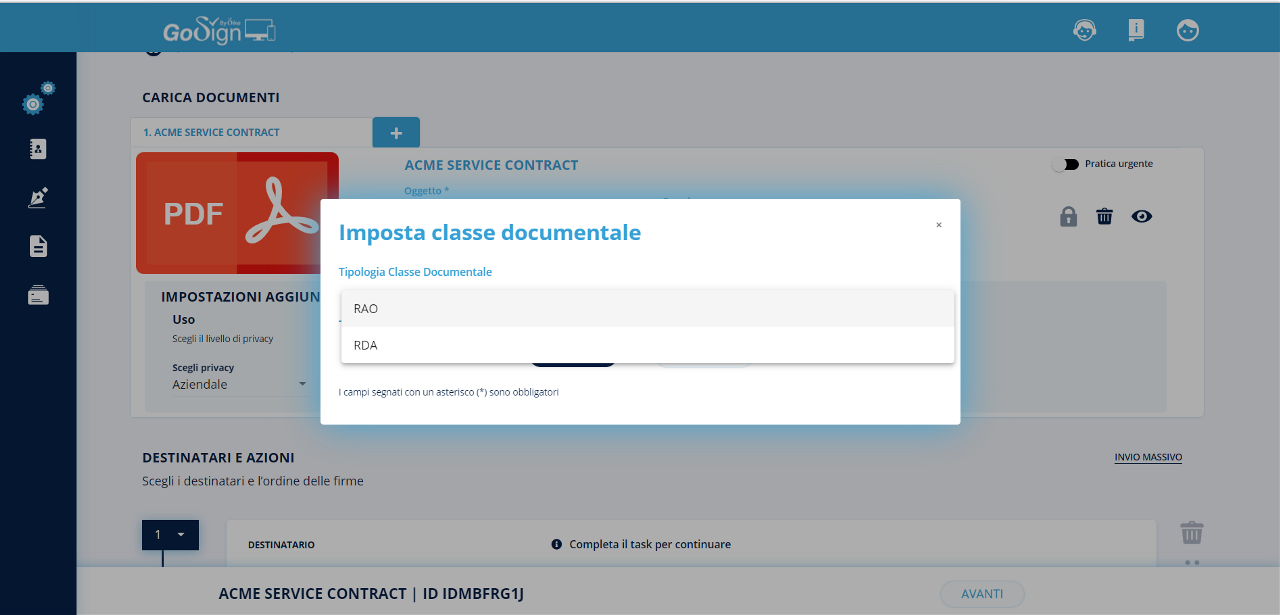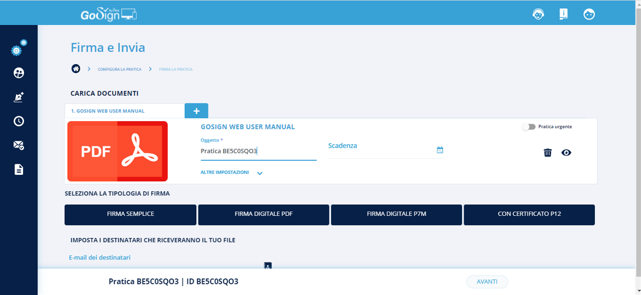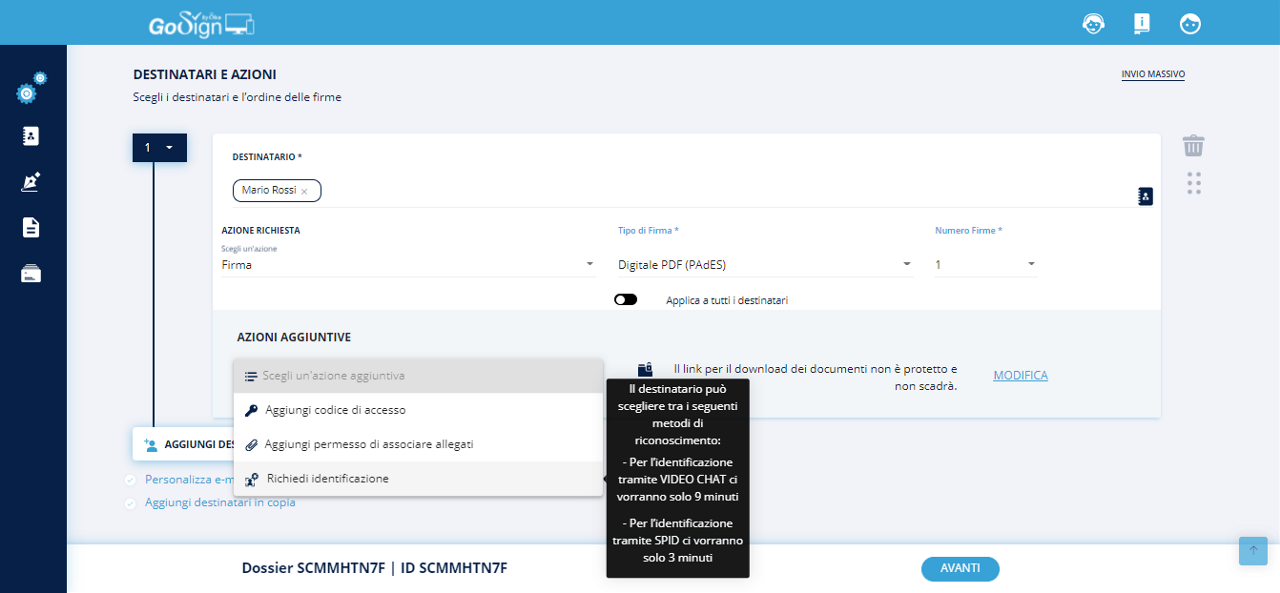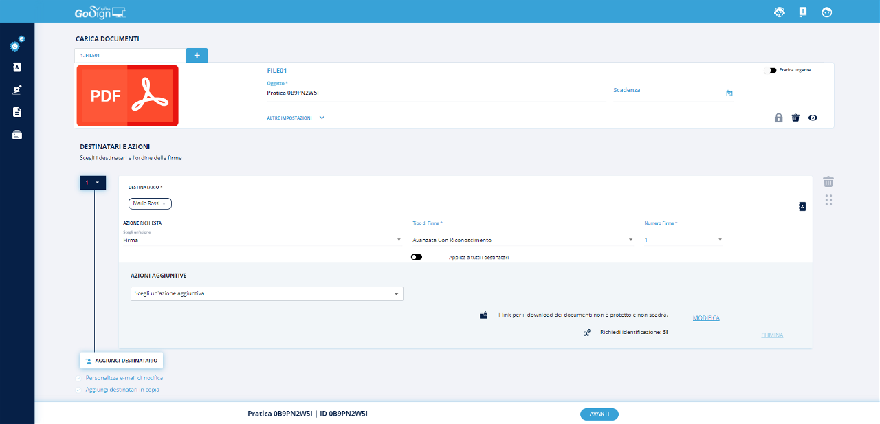Selezionando fra le diverse firme la tipologia firma avanzata con riconoscimento, verrà inserita di default la richiesta di identificazione. Il processo di creazione pratica si conclude come da procedura standard.