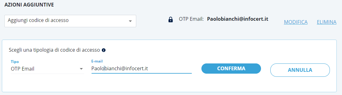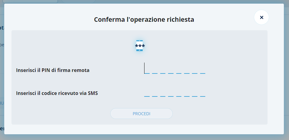 Una volta inserite le credenziali, è necessario cliccare sul pulsante Aggiungi, si aprirà un popup di conferma, dove verrà richiesto di inserire il PIN relativo alla firma remota e il codice OTP (che si riceverà sul numero di telefono associato al certificato di firma remota).