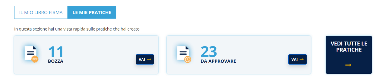 Cliccando sulla sezione VEDI TUTTE LE PRATICHE, la nuova schermata mostrerà in modo completo tutte le pratiche create dall'account. Tuttavia, se si clicca su uno dei pulsanti in alto a destra (In corso, Bozza, Completate, Archiviate), si verrà rindirizzati alla medesima schermata ma con le pratiche già filtrate.