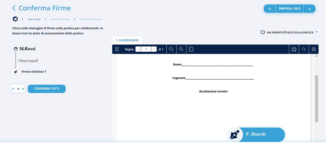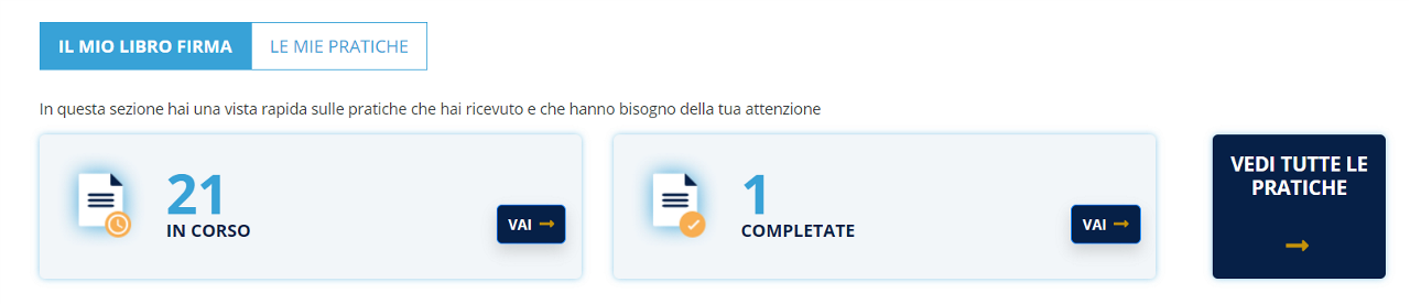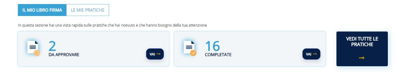 Cliccando sulla sezione VEDI TUTTE LE PRATICHE , la nuova schermata del LIBRO FIRMA mostrerà in modo completo tutti i processi di firma creati dall'account. Tuttavia se si clicca su uno dei pulsanti in alto a sinistra, si verrà rindirizzati alla medesima schermata ma con i documenti già filtrati mostrando solo i documenti che devono ancora completare il processo di firma oppure quelle già completate.