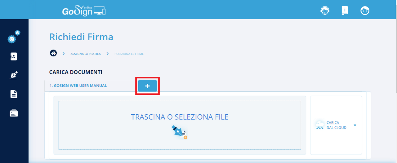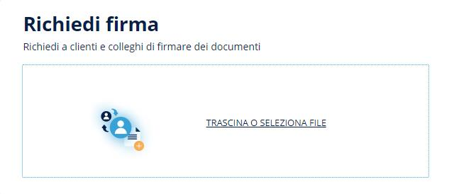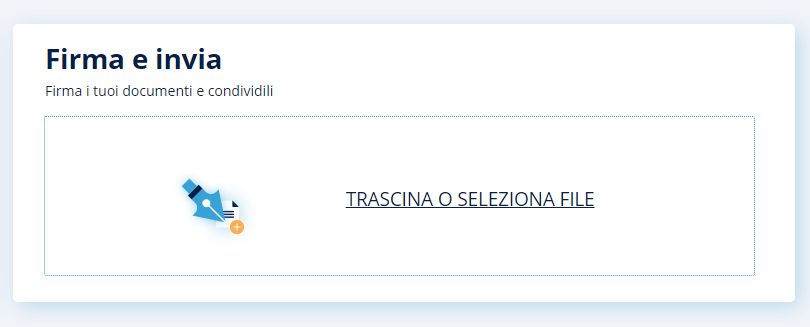 Firmare online: caricare uno o più documenti, decidere il formato di firma (.pdf, .p7m, etc.), inserire le azioni di firma sul documento e, se si vuole, il destinatario a cui inviare il documento firmato.