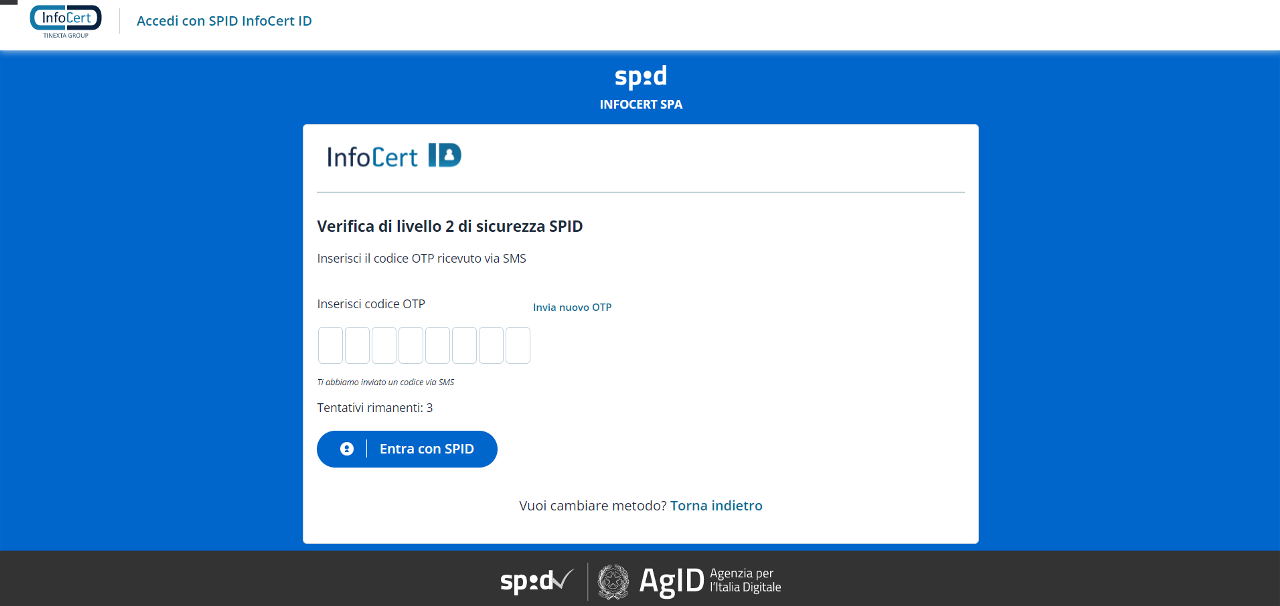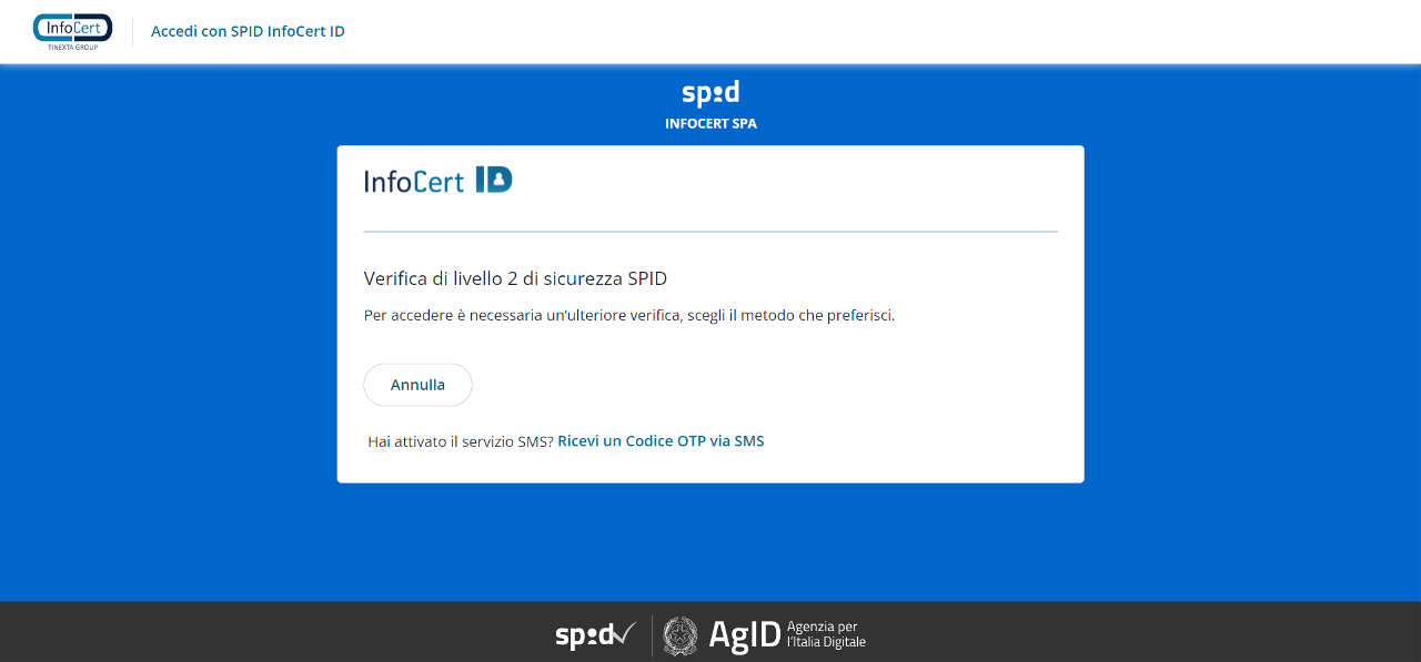 Una volta inserite le credenziali e cliccato su Entra con SPID, il sistema, qualora non rilevato, richiederà un livello 2 di sicurezza.
