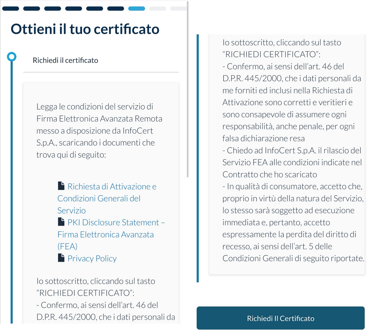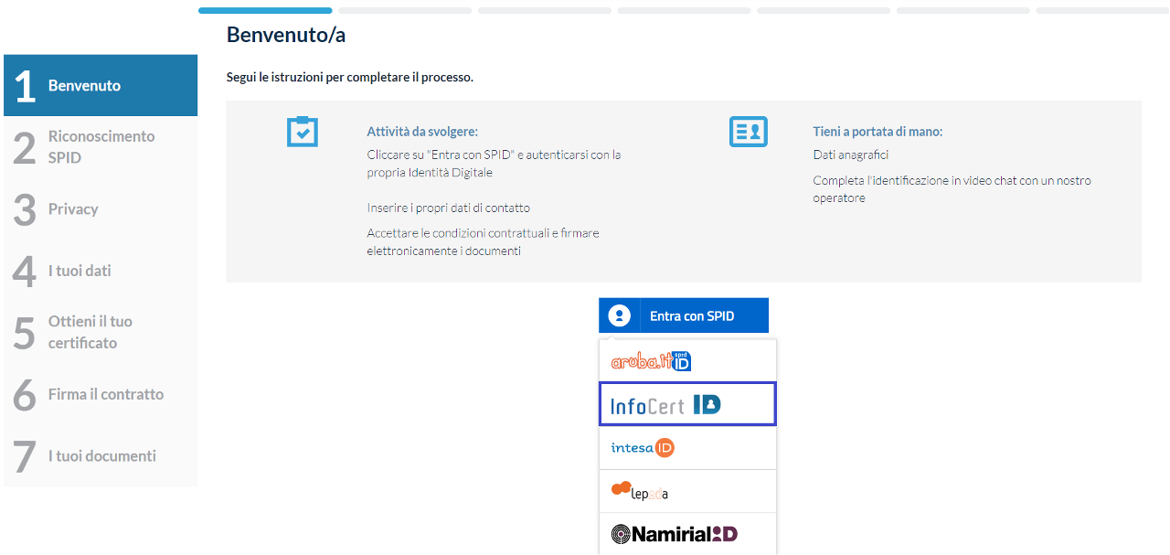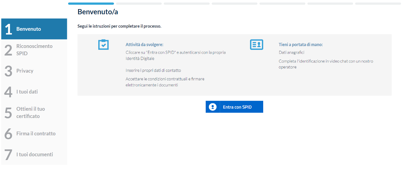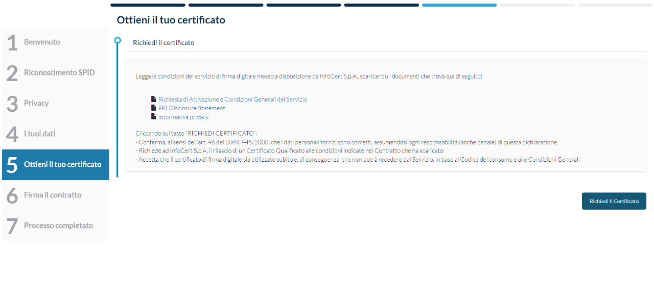 Una volta completato il riconoscimento, l’utente visualizzerà il contratto di richiesta certificato.