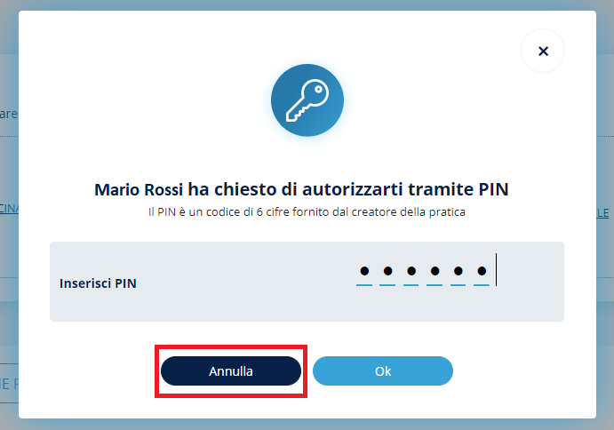 Consente di annullare la pratica in essere. Prima di annullarla definitivamente, viene chiesto di confermare l'azione tramite un popup.