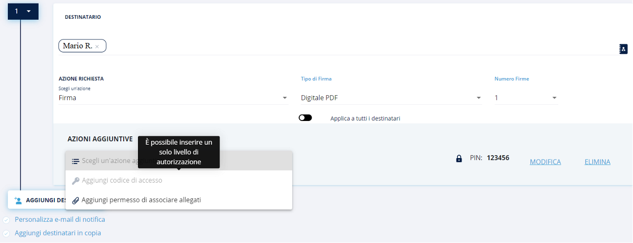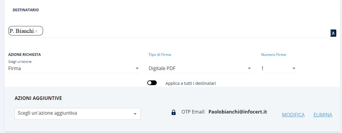 Anche la selezione dei destinatari non è obbligatoria; nel caso in cui si selezionassero i destinatari, bisognerà scegliere le azioni che devono essere finalizzate: