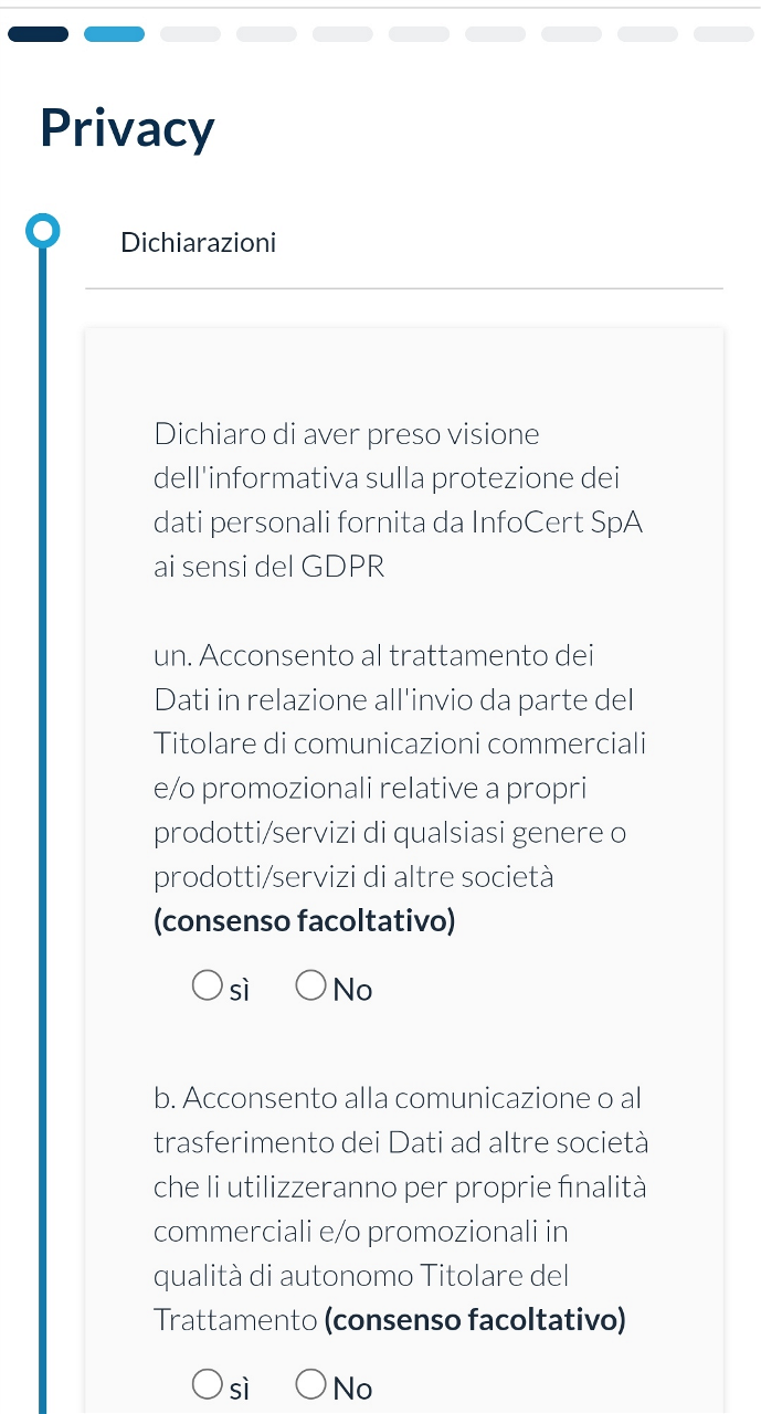 L’utente dovrà successivamente prendere visione della privacy policy ed accettarla.
