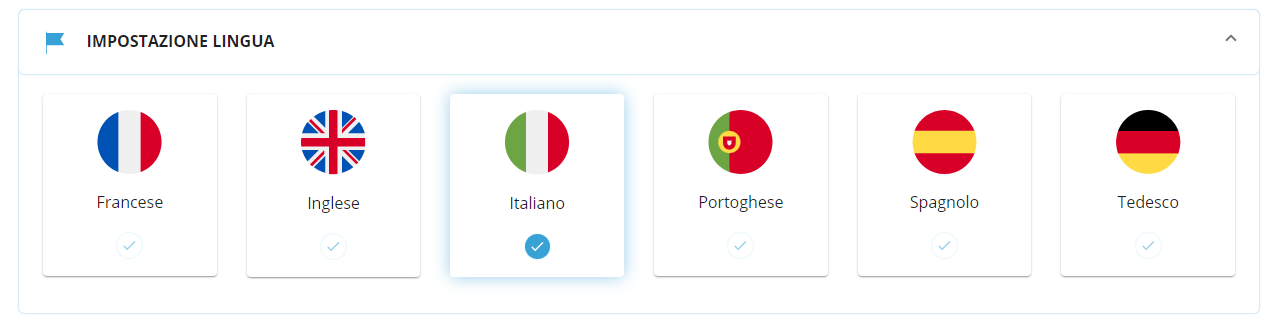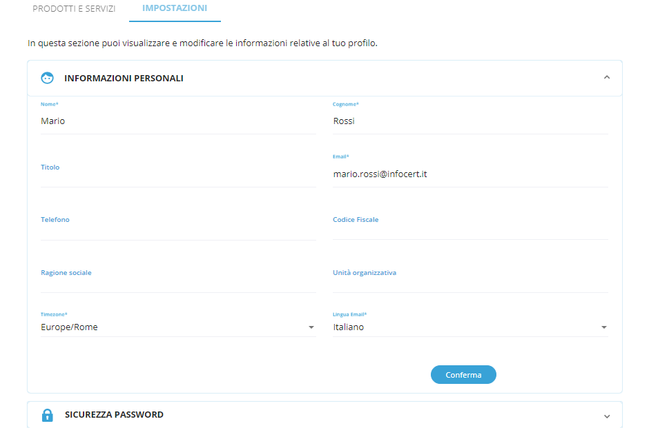 In questa sezione sarà possibile cambiare le proprie anagrafiche, l'email collegata all'account, la lingua con la quale si vogliono scrivere le email tra 6 lingue diverse (Francese, Inglese, Italiano, Spagnolo, Portoghese, Tedesco) e anche la Time zone, ovvero il fuso orario che si vuole applicare attraverso l'applicazione delle marche temporali.