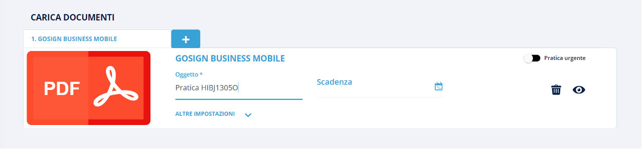 Una volta caricato il documento (o i documenti) verranno visualizzate alcune impostazioni relative alla gestione della pratica. Di default viene impostato un numero di pratica generato automaticamente , la scadenza ovvero la data entro la quale la pratica va conclusa e cliccando sull'icona del calendario si potrà impostare la data, l'icona del cestino permette di rimuovere il documento (ma prima di cancellarlo verrà visualizzato un messaggio che chiede la conferma di rimuovere il documento), l'icona dell'occhio da la possibilità di visualizzare il documento caricato.