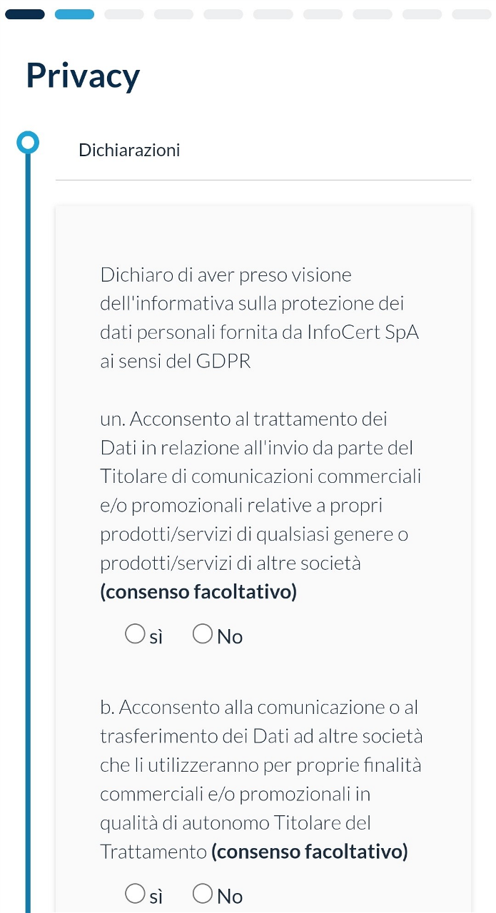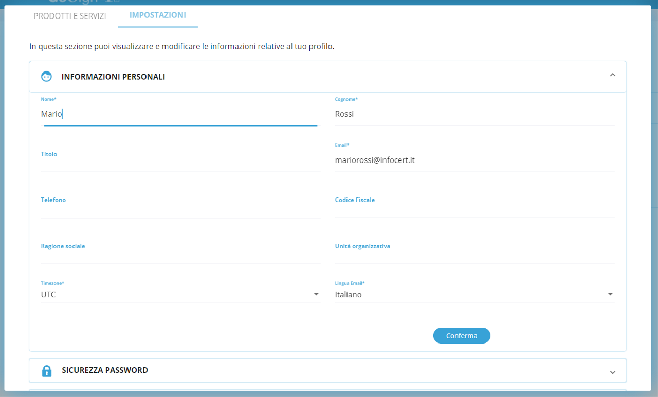 Se si sta effettuando l'accesso per la prima volta, prima di accedere al portale GoSign Web, si dovranno impostare le informazioni personali. Le informazioni richieste sono: