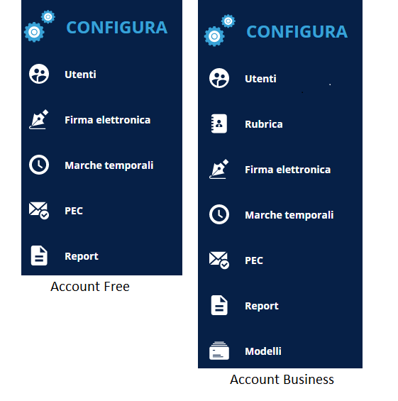 Alla sinistra della home page è presente il menu CONFIGURA (indicato dall'icona dell'ingranaggio);cliccando sull'icona si apre il menù nel quale è possibile configurare una serie di servizi che si hanno a disposizione a seconda del tipo di profilo acquistato.
