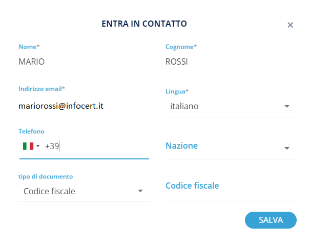 Una volta inseriti sarà sufficiente cliccare su SALVA per confermare la creazione del nuovo contatto.