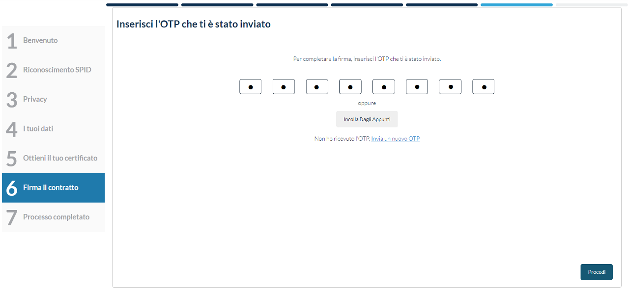 Una volta inseriti tutti i codici per attivare il certificato bisogna cliccare su PROCEDI.
