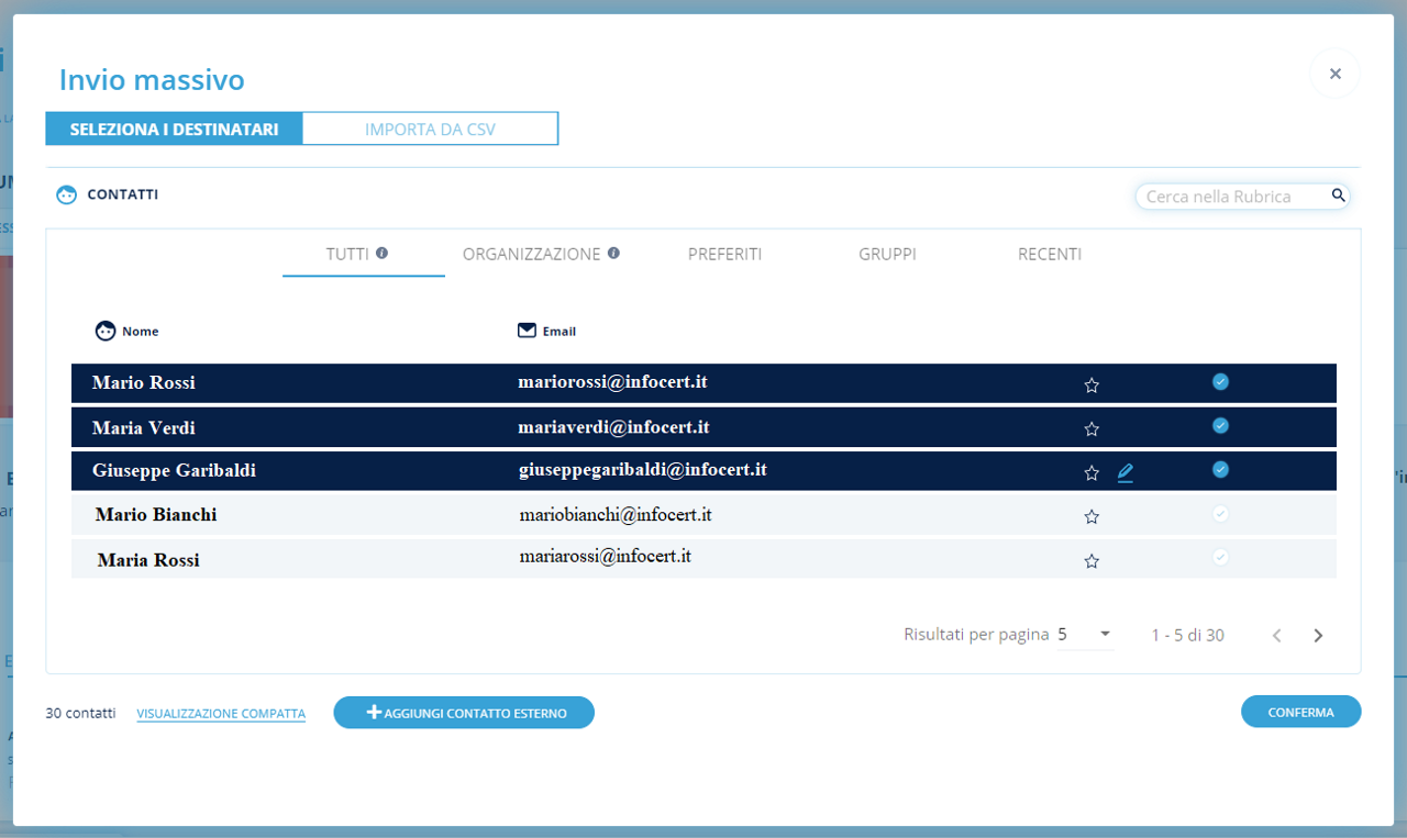 Per aggiungere uno o più contatti come destinatari della email che conterrà il documento sui cui lavorare, bisogna cliccare sulla riga del contatto che ci interessa, questo verrà evidenziato e per terminare l'operazione di aggiunta dei destinatari sarà sufficiente cliccare su CONFERMA.