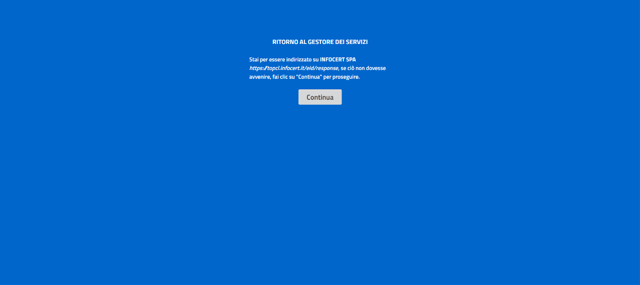 Dopo aver fatto clic su Autorizza, un messaggio a video indicherà che si verrà reindirizzati sul portale Infocert. E’ sempre possibile procedere in autonomia cliccando sul tasto Continua.