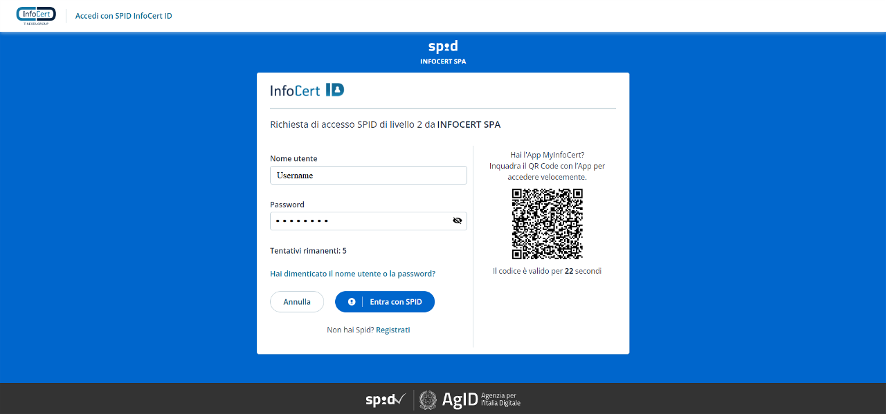 A questo punto si dovranno inserire username e password del proprio account SPID (oppure accedere tramite App MyInfocert scansionando il Qr-Code se in possesso di SPID Infocert).