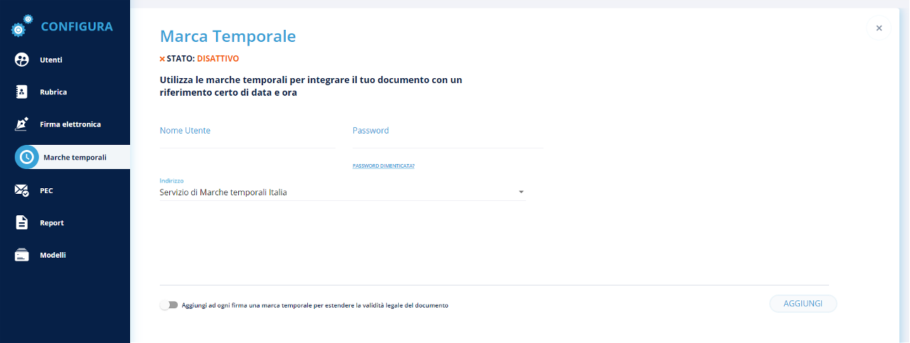 Durante la configurazione è possibile attivare l'opzione tramite la quale ad ogni firma viene aggiunta una marca temporale per estendere la validità legale del documento.