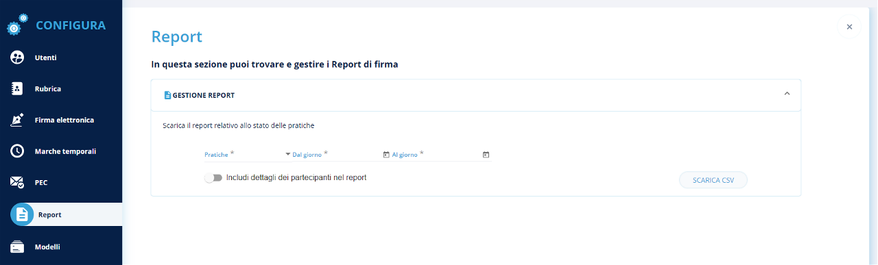 La sezione Report si trova nel menu CONFIGURA. Questa sezione è segnata con l'icona di un documento.