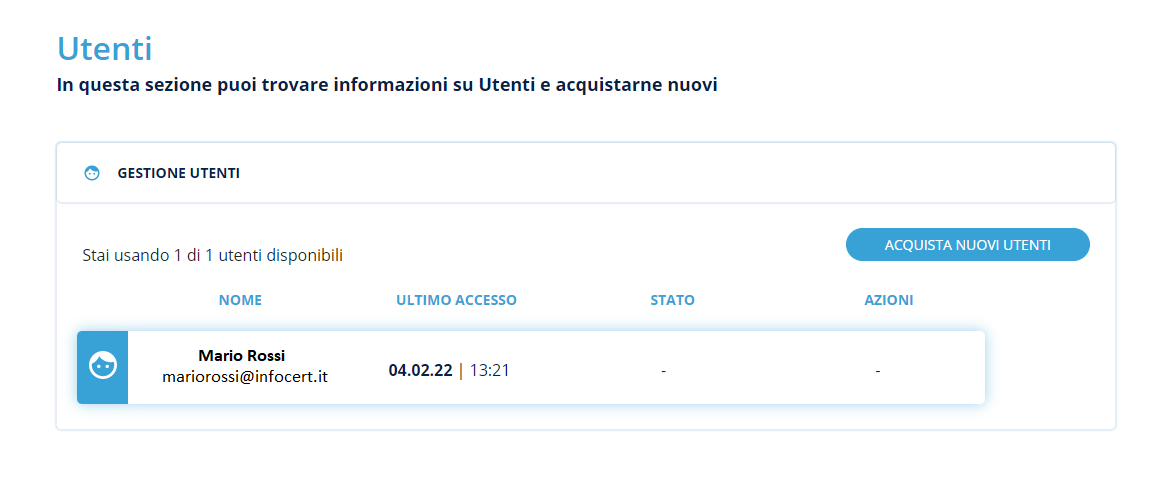 Se ci si trovasse nella necessità di aggiungere nuovi utenti sarà sufficiente cliccare su ACQUISTA NUOVI UTENTI; in questo modo si verrà reindirizzati al Negozio InfoCert per proseguire con l'acquisto.